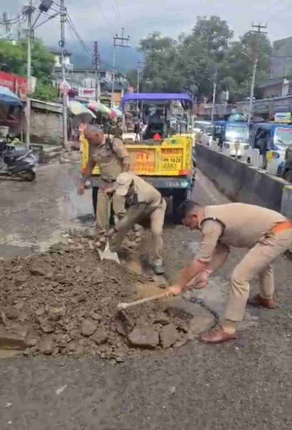त्रिवेणी घाट चौराहे पर चौकी प्रभारी विनेश कुमार सड़क के गड्ढे भरते का वीडियो सोशल मीडिया पर तेजी से वायरल।